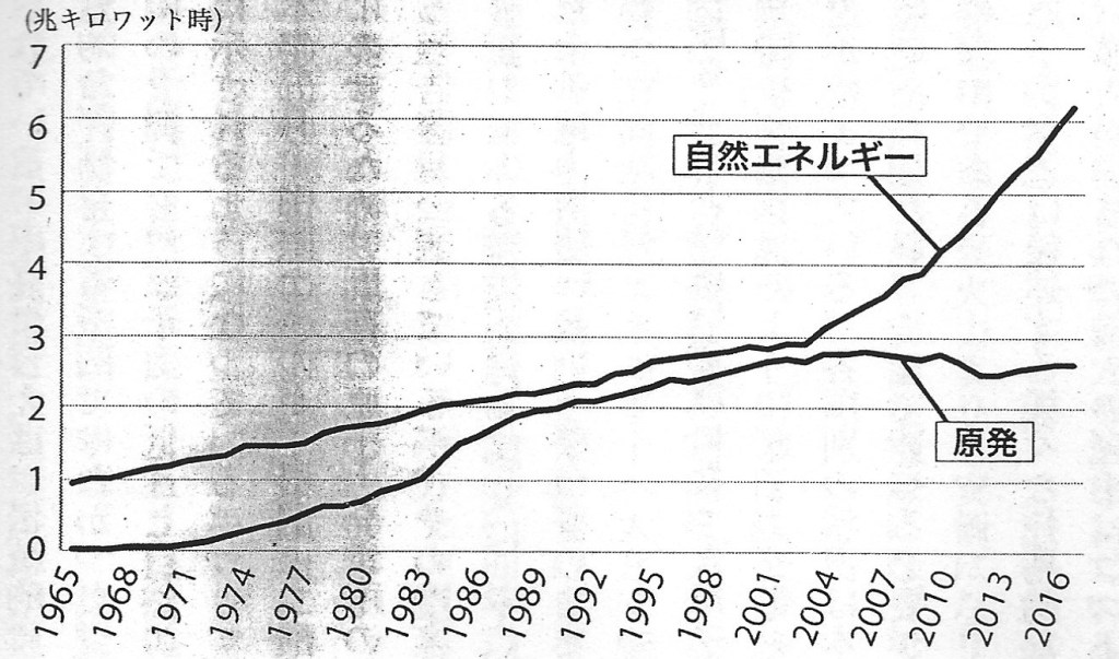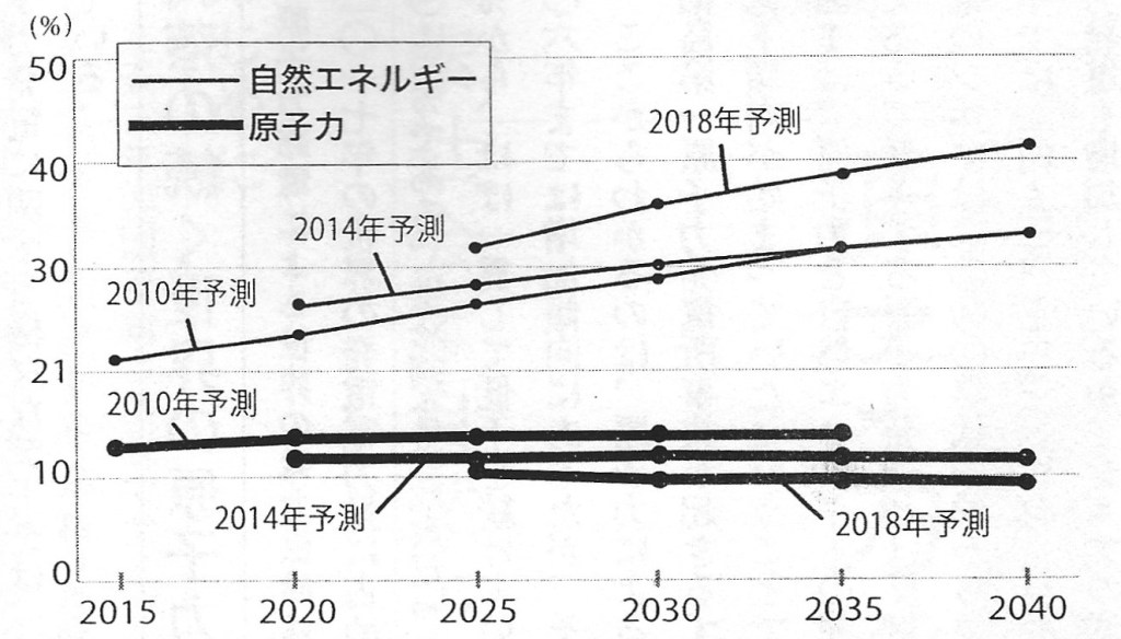 국제에너지기구는 원래 1차 석유 위기 이후인 1974년에 헨리 키신저 당시 미 국무 장관의 제창을 받아 설립된 것이다. 운영 예산에서 차지하는 일본의 분담금은 미국에 이어 제2위이고, 그 조사나 예측 결과는 신뢰도 높은 지식으로 취급되어 경제 산업성의 심의회 자료 중에서는 자주 인용된다. 솔직히 말해 전통적으로는 자연에너지를 호의적으로 평가하는 기관은 아니었다. 그 국제에너지기관의 예측에서도 원자력 침체와 자연에너지의 확대가 선명히 나타나게 되고 있다.