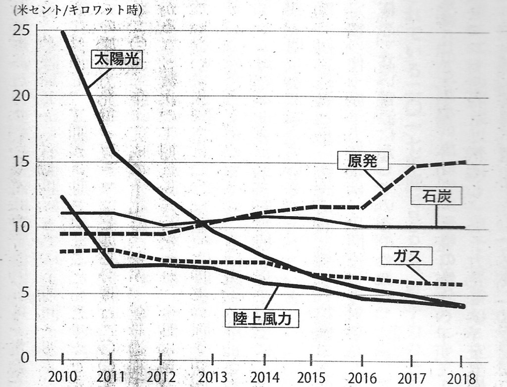 “자연에너지는 비싸다”라고 하는 말이 상식처럼 전해지고 있는 일본 독자들에게 이 라자드의 조사 결과는 당장 이해하기는 어려울지도 모른다. 그러나 이는 실제로 세계에서 벌어지고 있는 일이고, 이와 같은 결과는 금융정보 등 세계 경제 데이터를 제공하는 블룸버그사의 에너지 부문인 블룸버그NEF의 조사에서도 나타나고 있다. 2018년에 발표된 동사의 리포트에서는 “보조금 없이도 태양광 발전과 풍력 발전은 이제 석탄 화력보다 값싸졌고, 일본 이외의 모든 주요 경제권에서 가장 값싼 전원이 되었다”고 지적했다.