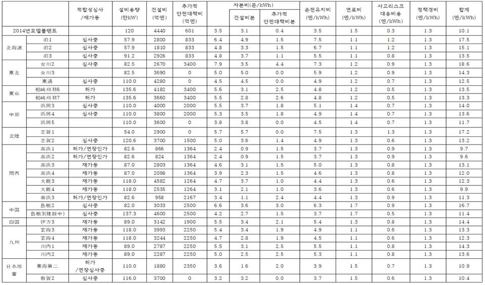 계산 결과를 다음 페이지의 표에 나타낸다. 이에 따르면 많은 원전에서 “2014년 모델플랜트”에 비해서 비용이 비싸다. 기존 원전의 평균은 13.2엔/킬로와트 시이다.