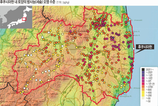 토양도 마찬가지다. 세슘137이 15㎝ 이상 깊은 곳까지 1만㏃/㎏ 수준으로 오염된 토양 위에 성인이 1시간 동안 서 있을 때 받는 방사선량은 0.00203m㏜ 수준이다. 하루 8시간씩 365일을 서 있으면 5.93m㏜ 정도가 된다. A교수는 “기준치는 넘지만 원자력 관련 종사자 허용 한도가 연간 50m㏜인 점을 감안하면 치명적이라고 말하기는 어렵다”고 설명했다.