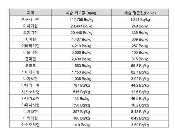 후쿠시마현에서는 세슘이 킬로그램당 최대 11만 2천 베크렐이 검출되었고, 후쿠시마현에서 가까운 미야기현, 도치기현도 최대 킬로그램당 2만 베크렐의 세슘이 검출되어, 사고로 인한 방사능오염이 지속되고 있음을 보여주고 있다.