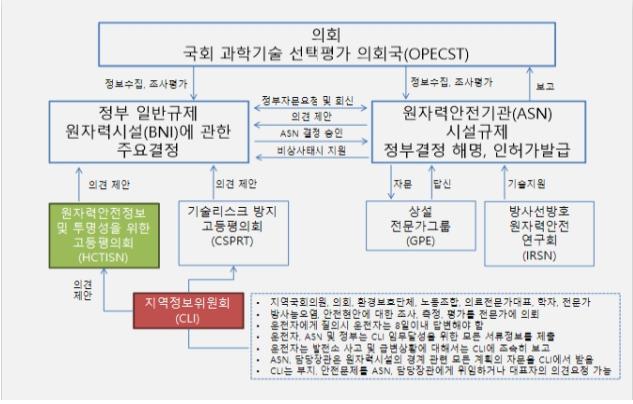 이러한 원자력안전기관에 제반 의견을 개진하는 조직들이 다양하게 존재하는데, 그것은 원자력 안전정보 및 투명성을 위한 고등평의회(HCTISN), 기술리스크방지고등평의회(CSPRT), 상설전문가그룹(GPE), 방사선방호원자력안전연구소(IRSN), 지역정보위원회(CLI), 국회과학기술선택평가국(OPECST) 등 각계각층, 전문가의 의견들이 다양하게 수렴되기 위한 조직들이 잘 구성되어 있다. 이는 논의과정을 중시하는 국민성이 잘 반영되어 있다고 볼 수 있다.