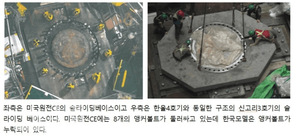 이로 인해 정상운전중 슬라이딩베이스는 설계허용값을 초과한 상태에 있다. 이 결함은 수년전까지만 해도 재질의 문제로 이해되었지만, 최근 ‘설계상의 결함’이라는 의심을 받고 있다. 한울3호기4호기는 미국CE-80모델을 본 따 개발한 한국형모델 APR1400인데 미국 것과는 다른 부분이 있다. 미국의 CE 모델에는 증기발생기의 하중을 지탱하는 슬라이딩베이스에 8개의 앵커볼트가 있는데, APR1400과 OPR1000에는 그 앵커볼트들이 빠져 있다.