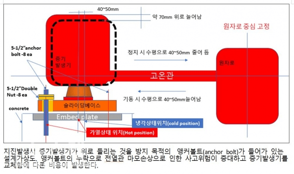 이 앵커볼트가 누락된 경위는 분명치 않다. 이 누락으로 인해 슬라이딩 베이스가 열 응력으로 변형되어 증기발생기 용기는 수직도를 유지하지 못하고 기울어져 주변 구조물과 접촉되어 장시간 진동이 일어나고, 그 영향이 증기발생기 내부로 전달되어 그 물리력이 전열관 마모로 이어진 것이다. 이 상황에서 약간의 충격적인 지진만 발생하더라도 결과를 예측할 수 없는 위험에 처한다. 지금 우리는 극도의 위험상황에 있다.