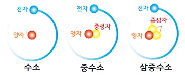 앞에서 언급했지만 삼중수소는 수소의 방사성 동위원소이다. 동위원소라는 것은 같은 원소인데 질량수가 다른 것을 의미하며 원소의 “핵종”과 같은 말이다. 핵종에는 “안정핵종”(안정형태)과 “방사성핵종”(방사성 붕괴하는 불안정형태)이 있다. 자연에 존재하는 수소의 대부분은 두 개의 안정핵종, 즉 수소와 중수소(듀테륨deuterium)이지만, 제3의 핵종으로서 “삼중수소(트리튬tritium)”도 있는 것이다. 이것은 대단히 낮은 농도에서 자연에도 존재한다.2 통상 수소원자가 양전자를 갖는 양자1개와 음전자를 갖는 1개의 전자로서 형성되는 것에 비하여 삼중수소는 전하를 갖지 않는 중성자 2개를 양자에 추가해서 질량수 3의 원자핵을 갖는 수소원자이다.[그림3]