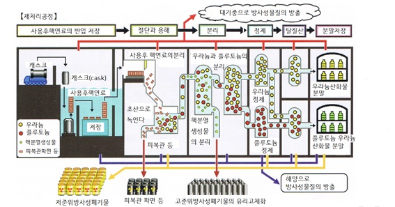 한편 일본의 반핵단체는 삼중수소와 관련해서 후쿠시마 핵발전소의 오염수 문제도 제기하지만, 더 큰 문제라고 생각하는 시설이 바로 핵 재처리시설이다. 우리나라는 아직 핵 재처리 시설이 없지만, 일본은 곧 가동할 예정이다. 일본정부는 홋카이도 바로 밑에 있는 아오모리현 롯카쇼무라에 재처리 공장을 세웠다. 롯카쇼무라에는 니혼겐넨(日本原燃)주식회사가 운영하는 우라늄 농축공장, 저준위방사성폐기물 매설센타, 고준위방사성폐기물 저장관리센터, 재처리공장 등이 밀집되어 있다. 핵연료의 재처리라는 것은 핵발전소에서 가동을 마친 핵연료를 수거하여 이를 정련한 후에 우라늄과 플루토늄을 생산한다. 한마디로 재처리 시설은 핵폭탄을 만들기 위해서는 필수적이다. 롯카쇼무라의 재처리 공장은 1993년 4월에 착공하여 2014년에 일본의 원자력규제위원회에 사용허가신청을 제출한 상태이다. 최근 일본정부는 사용허가 신청을 승인하려 한다는 보도가 나오고 있다. 다음 그림에서 보는 바와 같이 재처리공장에서는 절단, 용해공정에서 연료봉을 파괴하여, 연료봉 속에 포함되어 있는 삼중수소가 외부로 대량으로 방출된다. 연료 속 거의 모든 삼중수소가 방출되는 것이다. 상당히 두려운 사실이지만, 일반적으로는 거의 알려져 있지 않다.18