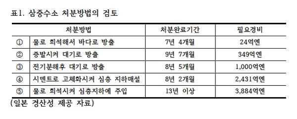 사실 오염수 처리방안이 꼭 해양방류 한가지만은 아니다. 일본정부가 인정한 여러 방법이 없지는 않다. 막대한 비용을 들인다면 삼중수소를 농축하는 것과 동일한 과정, 가스확산법이나 가스원심분리법 등으로 몇십 단계를 반복하여 제거할 수 있다. 그러나 이런 비용의 투입은 핵발전소 가동에 엄청난 비용이 들어간다는 점을 아주 구체적으로 확인시켜주는 것이다. 당연히 핵발전소에 대한 여론은 더 나빠질 수밖에 없다. 주민들로서는 여러 상황을 판단한 끝에 부지추가 확보를 통한 계속적인 탱크보관을 강력하게 요구했다. 일본 경산성은 오염수 처리에 대해 다음 [표1]1의 방식을 제시한 바 있다. 일본정부가 최종 선택한 것은 바로 돈이 가장 적게 들어가는 방식이다.