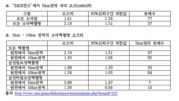 2007년 12월에 독일의 환경부와 연방방사선방호청이 “원전 16기 주변의 41개 시군구의 5세이하 소아암 발병률의 조사연구(KiKK 연구)결과”를 공표했다. 31) 이 결과는 “통상적으로 운전중인 원자력발전소 주변 5km 권역 내에서 소아백혈병이 고율로 발병한다.”는 내용이었다.
