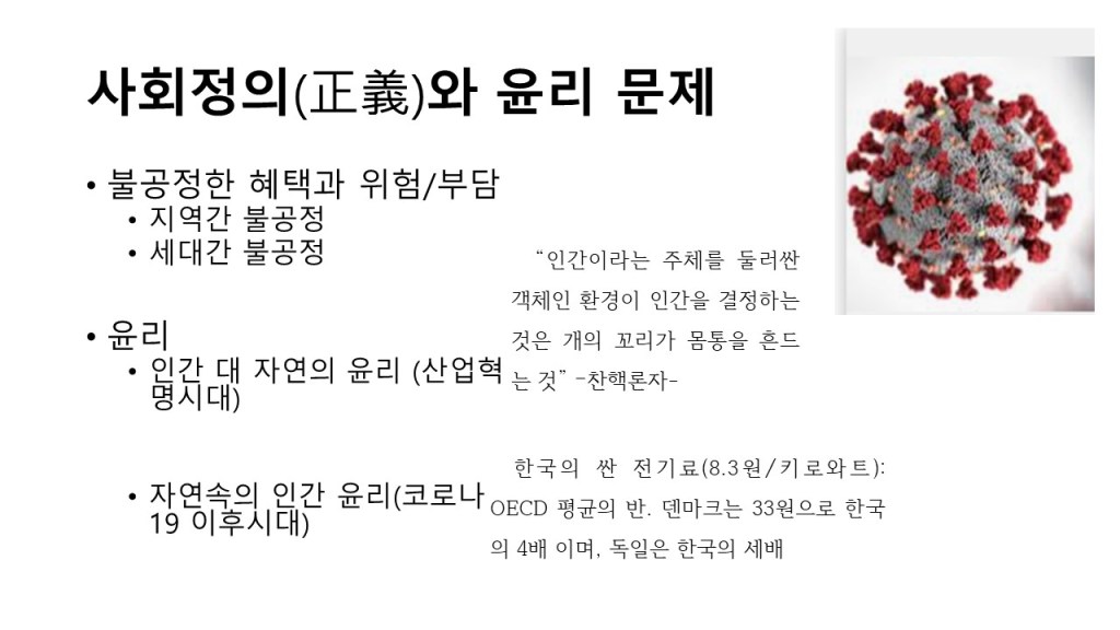 코로나19 바이러스는 지구를 강타했다. 많은 사람들이 희생되고 있으며, 실직의 고통, 가택연금 생활의 불편을 감내해야 했다. 사람들은 이전에 누렸던 평범한 일상을 동경하게 되었고, 그런 생활로 돌아가고 싶어 한다. 전문가들은 이같은 전염병의 발생이 이번이 마지막이 아니라 앞으로 자주 겪게 될 것이라고 경고한다. 코로나19 사태는 모든 것이 서로 연결되어 있다는 오래된 진리를 망각하거나 모르고 살던 사람들에게 “이래도 모르겠냐?!”는 깨침을 촉구하고 있다. 이전으로 돌아가서는 안 되고, 삶의 방식을 바꾸어야 한다는 명령이다. 이전이란 산업화 시대와 후기 산업화 시대, 정보화 시대를 포함한 코로나19 이전까지의 시대이다. 많은 학자들은 오늘날의 시대가 소위 인류세(anthropocene)라고 불리울 수 있다며 경고한다(Crutzen & Stoermer, 2000). 지구의 역사에서 볼 때 아주 미미한 시간대에 불과하지만 인류세가 생태계에 미친 영향은 어마어마 하였다. 인류세 시대에는 인간이 자연을 이용 가능한 자원으로 여기며 마음 내키는대로 이용하고, 변용하며, 인간의 편의를 위해 모든 것을 도모하는 것이 당연한 시대정신으로 받아 들여졌다. 그러나 이제 바뀌어야 한다. 효율과 경제학적 가치로 모든 것을 환산하는 현시대적 관점에서 벗어나 생태계의 관점에서 옳고 그름을 재단하는 관점으로의 전환이 필요하다. 탈핵운동은 그 전환의 실천이 되어야 한다.