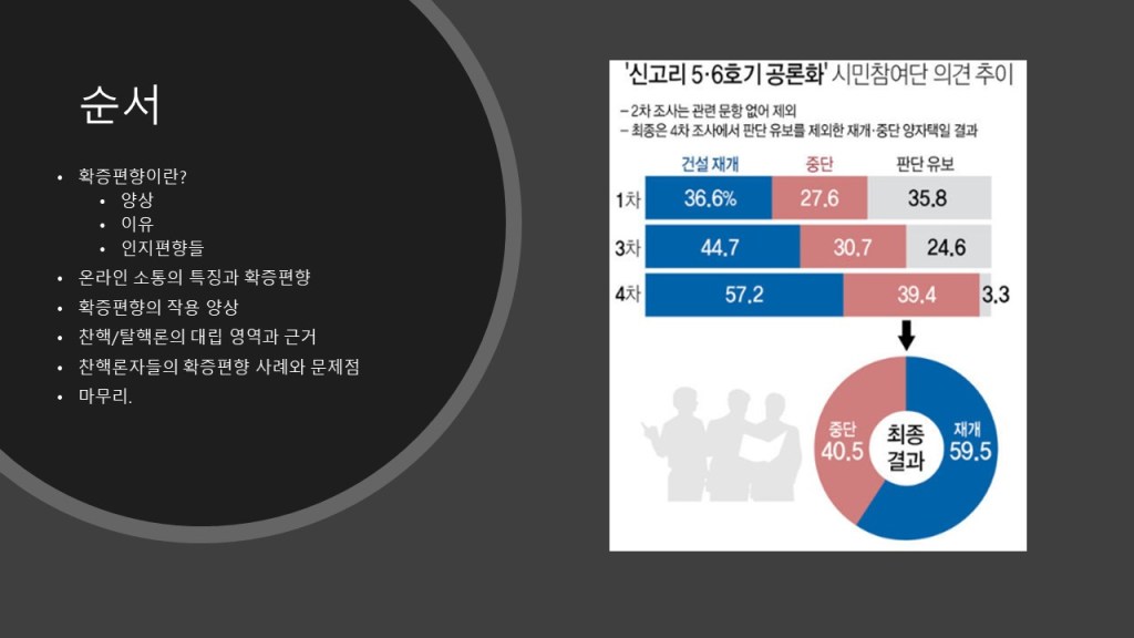 2017년 문재인 정부가 출범하면서 내 건 탈핵정책은 환경 분야와 시민 운동권의 큰 호응을 받았다. 그러나, 이 방침은 기존의 원자력 생태계에 종사하는 많은 사람들의 반발과 저항을 직면하고 있다. 건설공사가 중단된 신고리 5, 6호기 공사를 재개하느냐 아니면 건설을 중단하고 폐기하느냐라는 문제를 해결하기 위하여 공론화 위원회가 운영되어 시민투표단 500명을 대상으로 한 달간의 교육과 숙의 및 투표가 이루어졌다. 한 달에 걸친 숙의와 교육과정에서 참여단은 건설재개를 둘러싸고 대립하는 양 진영의 전문가들의 홍보와 설득을 들어야 했고, 개인별로 최종 판단을 하였다. 양 진영 모두 자신들의 주장을 정당화시키면서, 중립적인 사람들을 끌어들이고, 반대진영의 사람들의 태도를 바꾸려는 노력을 펼쳤다. 참여자들은 참여 시점의 조사에서 건설재개 의견을 가진 사람(36.8%), 건설 중단 의견을 지닌 사람(27.6%), 판단을 유보하고 있는 사람(35.6%)들로 대략 삼분되었다. 한 달의 숙의 기간 동안 4차례의 투표가 있었고, 마지막 투표에서 공사재개의 의견이 일차 조사보다 23%가 증가하고, 중단은 13%가 증가하였다. 이 숫자의 변화로 보면 공론화 초기에 확실한 의견을 지녔던 사람들은 숙의 과정에서 태도변화를 보인 사람은 적었고, 유보적 태도를 지닌 사람들(전체의 35.6%)이 한 달의 숙의 후에 공사재개(23%) 혹은 공산중단(13%) 쪽으로 태도를 바꾼 가능성이 높으리라는 것을 알 수 있다. 한편 장기적인 원자력발전의 정책방향에 대한 투표 결과를 보면 1차에서 원전축소가 39.2%였으나 4차 투표에서는 53.2%로 증가하였고, 1차에서 12.9%였던 원전확대는 9.7%로 줄었으며, 31.1%이었던 원전유지는 35.5%로 소폭 늘어난 것으로 나타났다. 이런 조사 수치에서 볼 수 있듯이 많은 국민들은 장기적으로는 원전축소와 탈핵의 방향으로 가되 건설 중인 발전소의 중단이 현실 경제에 끼칠 수 있는 과중한 부담을 꺼려하고 있음을 알 수 있다.