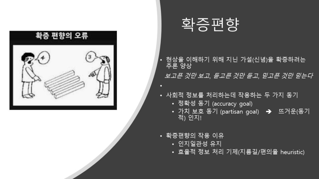 사람들은 사회생활하면서 접하는 수많은 정보들에서 중요하다고 여기는 쟁점에 대하여 올바른 판단을 하기 위하여(accuracy goal) 정확한 정보들을 수집 파악하고자 하며, 자신에게 중요한 가치와 준거(중요한 소속 집단이 지니거나, 자신이 살면서 지켜왔던 것들)들을 지켜가고자 하는 동기(partisan goal)를 지니고 있다(Kruglanski & Webster, 1996). 특히 후자의 동기 탓에 흔히 이성적 사유가 그리는 것처럼 사람들이 중립적인 입장에서 쟁점과 관련된 여러 가지 증거와 주장들을 객관적으로 검토하여 판단을 하는 것이 아니라, 자신의 취향, 태도, 소속 등에 의해서 지니게 된 입장을 강화시키는 쪽으로 정보를 수집하고, 해석하며, 판단을 한다는 것이다. 그래서 사회생활에서 사람들이 보이는 인지(認知)는 냉정한 것이 아니라 ‘뜨거운’ 인지, 즉 동기화된 인지의 영역이다(Kunda, 1990). 소수자 권익보호에 대하여 우호적인 사람과 반대하는 사람들을 대상으로 소수자 운동에 우호적인 내용의 글과 반대하는 내용의 글을 제시하고 처리하는 양상을 본 결과, 태도가 어느 쪽으로든 강한 사람들에게서는 자기입장에 우호적인 정보를 거의 무비판적으로 설득력이 강한 것으로 여기는 확증편향(confirmation bias)과 더불어 반대적인 정보를 접하면서는 내용에 대해 회의적이며, 비판적인 생각을 하는 부인편향(disconfirmation bias)이 동시에 나타났다(Taber & Lodge, 2006). 소수자 권인보호에 대하여 중립적이거나 애매한 태도를 지닌 사람들에게서는 이런 양상이 나타나지 않았다. 중립적인 태도를 지닌 사람들이 정보를 균형있게 처리하기 때문이라기 보다는 쟁점에 대한 관심이 적어서 정보처리를 신중하게 하지 않는 탓이다.