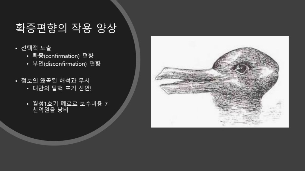 원자력발전은 쟁점이 많고 복잡한 탓에 자기의 신념에 부합하는 것과 모순되는 것들이 공존하게 마련이라서, 모순되는 것을 무시하거나 평가절하하고, 신념에 부합하는 것을 챙기고, 모호한 것들은 신념을 지지하는 것으로 여기는 확증편향이 작용할 가능성이 매우 높다. 그 양상을 구체적으로 살펴 보자.