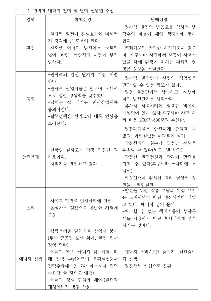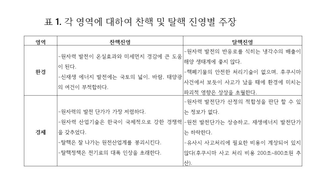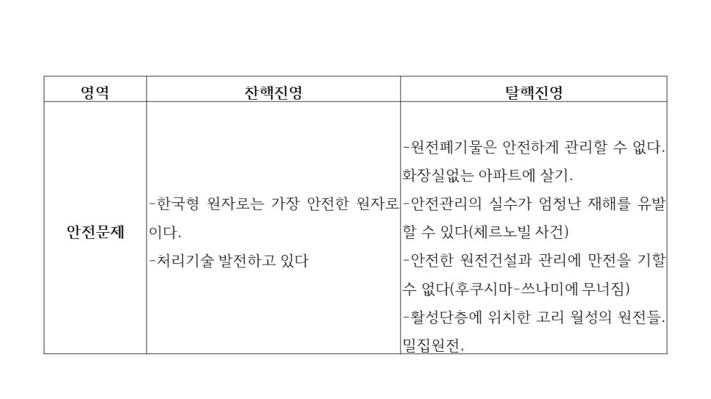 찬핵/탈핵 진영이 대립하는 영역과 그 근거