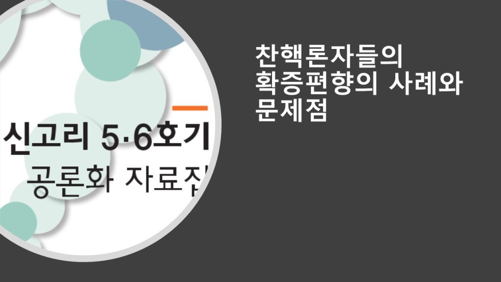 상기한 각 영역에서 탈핵론자와 찬핵론자들은 나름의 주장을 정당하다고 볼 수 있는 근거를 끌어올 수 있다. 양 측 모두 그런 판단과정에서 확증편향이 작용할 수 있다. 그러나 이글에서는 찬핵론자들의 확증편향을 위주로 짚어 보겠다. 탈핵론자들도 확증편향의 양상을 당연히 보이지만 자기의 이익을 보호하려는 의식 무의식적 동기에서 찬핵론자들의 확증편향이 강하게 나타날 수 있기 때문이다. 여기서는 〈신고리 5·6호기 공론화 자료집〉에 나온 내용을 중심으로 찬핵론자들의 주장을 살펴 보겠다. 이 자료집을 택한 이유는 탈핵론과 찬핵론이 신고리 5·6호기 건설/중단으로 심각하게 대립하였고, 한 달여의 숙의기간 동안 양 진영은 최선을 다하여 설득력 있는 주장을 마련하였다고 볼 수 있기 때문이다. 다만 여기서는 원전 산업 전반에 대한 내용을 위주로 보며, 신고리 5 6호기에 국한되는 것을 빼겠다.