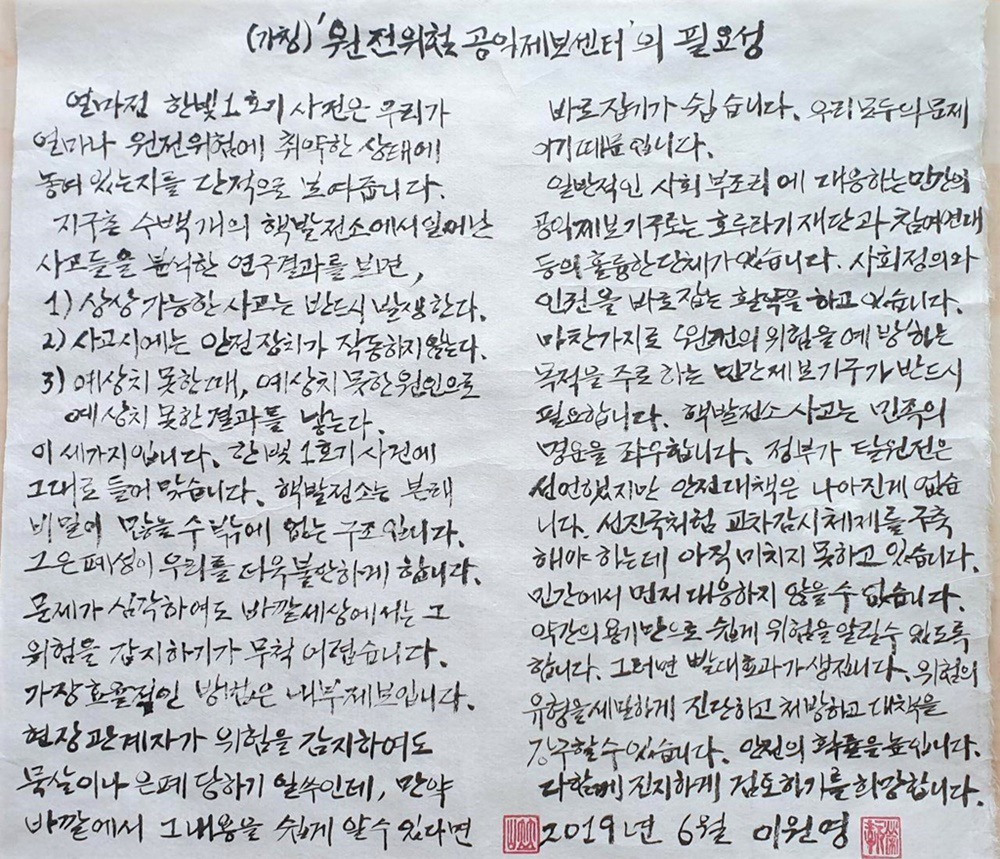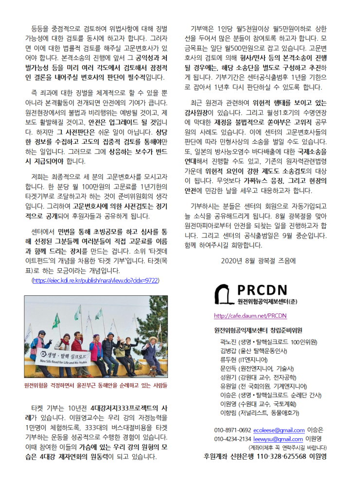 기부하시는 분들은 센터의 회원으로 자동가입되고 늘 소식을 공유해드리게 됩니다. 8월 광복절을 맞아 원전마피아로부터 안전을 되찾는 일을 진행하고자 합니다. 그리고 센터의 공식출범일은 9월 중순입니다. 함께 하여주시길 희망합니다.