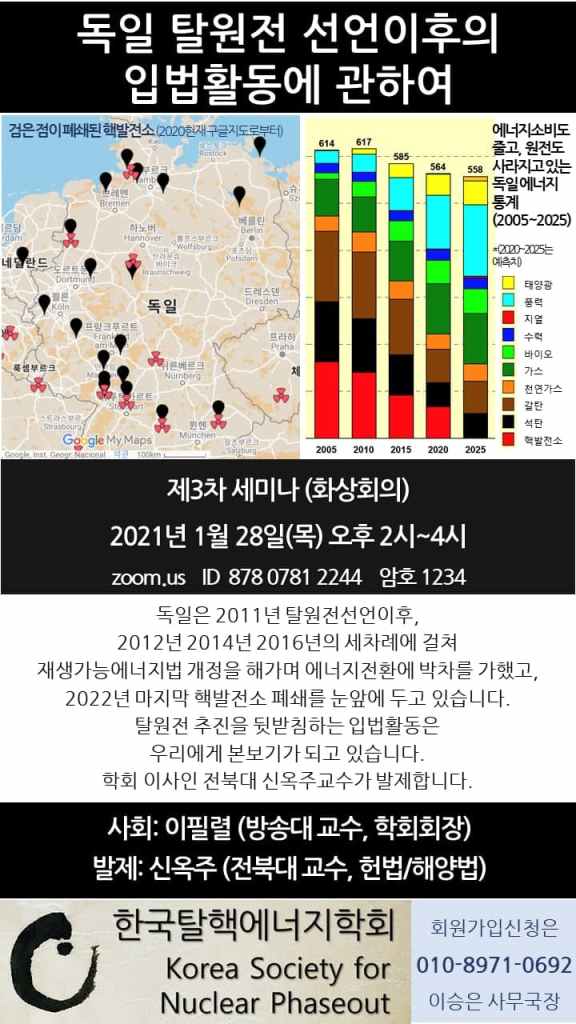 [제3차 세미나] 독일 탈원전 선언이후의 입법활동에 관하여 By liferoad.org on 1월 3, 2021 • ( 0 ) 이 글 공유하기: 클릭하여 X에서 공유 (새 창에서 열림) X 페이스북에 공유하려면 클릭하세요. (새 창에서 열림) Facebook 좋아하기 가져오는 중...‹ [제2차 세미나] 탈원전 논쟁, 제대로 이해하면 필요없다[기사] “월성원전 감사·수사는 민주주의 부정 행위”(이투뉴스) ›카테고리:01월호-2021년 춘계학술대회 공지
