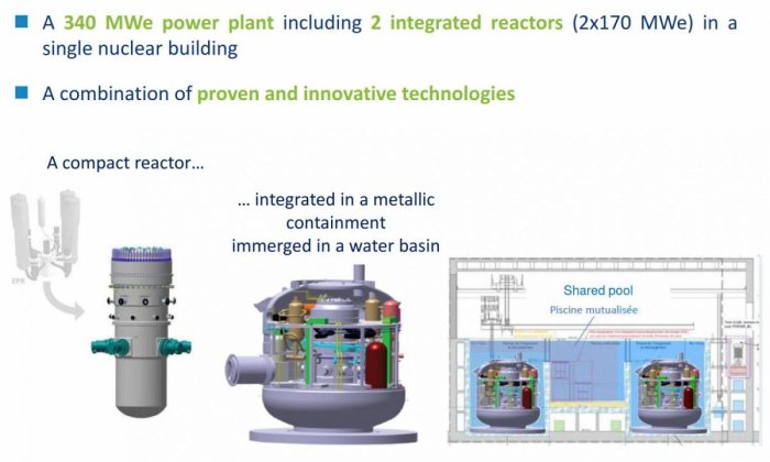 Reporterre에 있는 EDF 대변인은 “이 원자로는 작고 콤팩트 할 것”이라고 설명한다. 그것은 훨씬 작은 공간을 차지하는 잠수함 기술에서 영감을 얻은 판 증기 발생기를 장착할 것이다. 가압기와 증기 발생기는 탱크에 배치된다. 이 모든 것은 올림픽 수영장 크기의 절반인 25 x 25 미터의 물에 잠긴 봉쇄된 내부에 들어가 수동 안전 장치로 제공된다. 또 다른 특징은 원전의 각 부품들이 공장에서 제조되어 트럭이나 보트로 현장에 운송된다는 것이다. ” 이 아이디어는 현장에서의 재조립작업을 최소화하도록 한다”라고 EDF는 설명한다.
