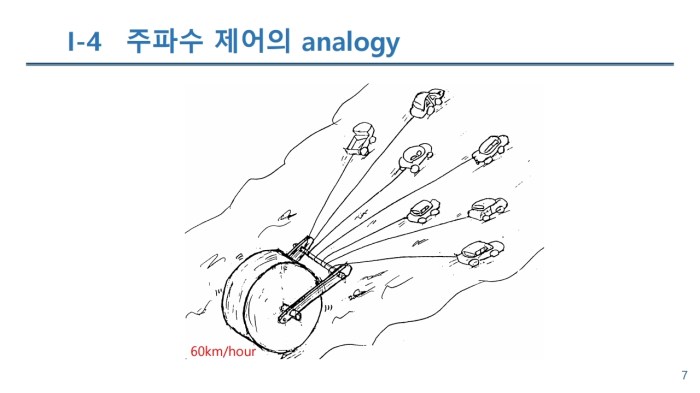 그래서 우리 전력 시스템에는 많는 발전기가 연계되어서 에너지를 공급하고 있습니다. 그런데 그렇게 발전기가 많이 연계되어서 운전이 되어도 회전속도는 전부 다 똑같습니다. 주파수가 올라가면, 어떤 특정한 한 발전기만 올라가는 게 아니고, 이 발전기가 전체 발전기와 에너지를 공유합니다. 그래서 특정 발전기 속도가 올라가면 다른 발전기도 같이 올라가고, 떨어지면 다른 발전기도 같이 떨어집니다. 그걸 어떤 걸로 설명할 수 있냐면, 자동차가 이 매스(mass:덩어리) 바퀴를 끌고 올라가는데 60km/hour속도로 끌고 올라가죠. 근데 이 자동차는 트럭도 있고, 조그마한 경차도 있고 버스도 있고 여러 가지 종류가 있는데 이 60km/hour속도로 끌고 올라가는 속도는 모든 자동차가 다 똑같은 속도로 올라가야 60km/hour속도로 끌고 올라가는 게 되는데요. 그래서 이렇게 끌고 올라가다가 자동차 하나가 엔진이 고장 나면 속도가 떨어지겠죠. 힘이 모자라니까. 속도가 떨어지면 다른 자동차들이 힘을 더 내서 끌고 올라가는데 엔진이 고장 난 이 자동차도 같은 속도로 다른 자동차와 같이 올라간다는 그런 의미가 됩니다.