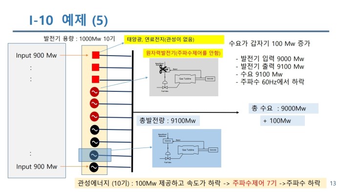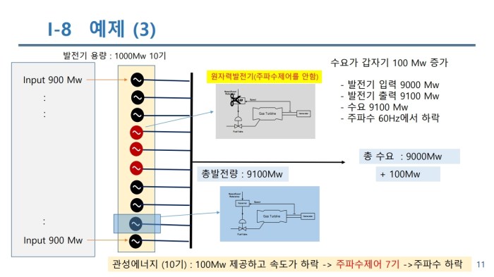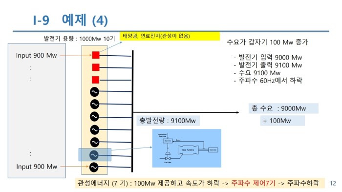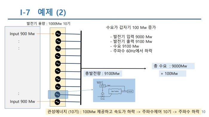 여기서 한 가지 더, 지금 원자력발전기도 있고 태양광도 들어와서 기존의 발전기가 10대에서 4대밖에 안 남았어요. 이때 수요가 100Mw로 늘어날 때, 즉, 운동에너지를 가지고 있는 발전기는 7대가 있는데, 주파수를 제어할 수 있는 것은 4대밖에 없어요.