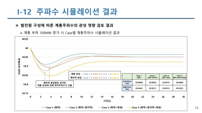 해외에서도 설명하고 있는 게 재생에너지가 많이 들어와서 발전기 숫자가 줄어들면은 똑같은 상황에서 주파수가 많이 떨어진다는 게 나와 있습니다. 앞에서는 저희 연구실에서 예제를 가지고 시뮬레이션한 거고, 이것은 해외자료에서도 설명하고 있다는 같은 내용입니다.