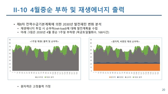 2030년도 발전기 패턴(일주일)을 컴퓨터 시뮬레이션으로 돌려봤는데요. 어느 발전기로 돌리는 게 가장 싼지 우리나라 전체 발전기 데이터를 다 넣어서 돌려봤어요. 맨 위가 전체 부하고요. 초록색이 재생에너지 출력인데요. 발전에너지가 발전해야 될 패턴이 회색으로 바뀝니다. 발전기를 껐다가 켰다가 하는데 토요일이나, 일요일은 돌아가는 발전기 숫자가 급격하게 줄어듭니다. 여기에서 만약에 오른쪽 그래프 주황색이 원자력인데 원자력이 이 주황색만큼 있다면 일요일에 발전기를 출력을 줄였다가 다시 출력을 올려야 되는데 출력을 제어할 수 있는 발전기 숫자가 적어지기 때문에 가능한 발전기 모두 출력을 최대로 조정을 해서 재생에너지 출력 변화를 못 따라가요.
