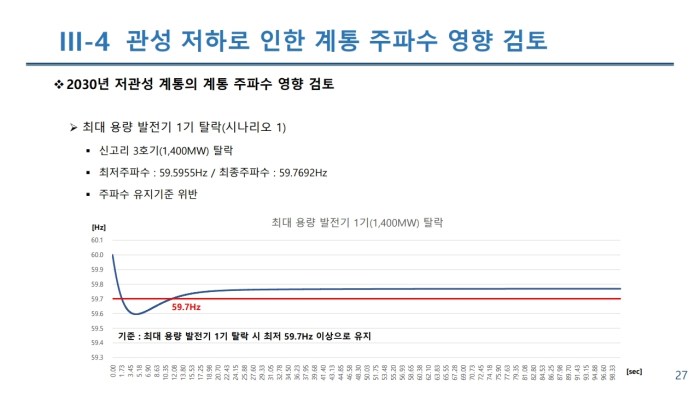 2030년 저관성에서 발전기 2개가 탈락하면은 59.2Hz까지 가고요.