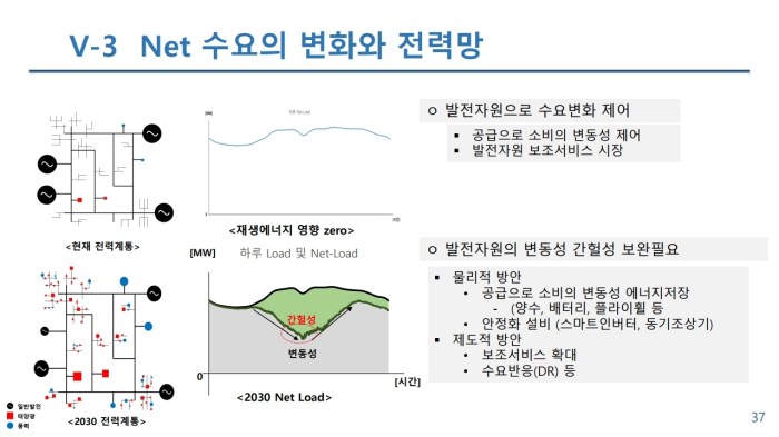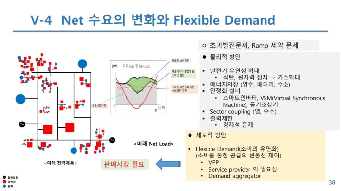 옛날에는 수요가 일정한 모양이었다면 재생에너지가 많아지니까 순수요가 중간에 내려갔다가 올라오게 됩니다. 이걸 맞춰서 운전하는게 문젠데요. 재생에너지가 점점 더 많아지면 수요패턴을 소비의 유연성에 의해 균일하게 조정할 수 있으면 좋잖아요. 전력소비를 전기 요금이 쌀 때 많이 하고, 비쌀 때 적게 하도록 만들어야 하는데 -즉 전력시장에서 에너지 공급 상황에 따라 가격이 싸게도 나오고 비싸게도 나와야 하는데- 우리나라는 안 되어 있다는 점이죠. 그것뿐 아니라, 더 생각해야 할 점이 해오의 경험에서 일반 국민들은 전기요금에 반응하는 것도 제한적이라고 알려져 있습니다. 싸다가 비싸다가 하면 귀찮아하고 오히려 싫어하는 경향이 있습니다. 전기요금 때문에 바쁜 내가 신경쓰기 싫다는 사람도 있고요. 그래서 일반 소비자 대신에 전기 요금에 따라 소비를 조절하는 서비스 회사가 생겨야되는 거죠.