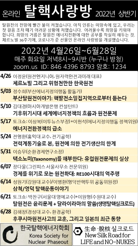 탈핵사랑방 By liferoad.org on 4월 6, 2022 • ( 0 ) 이 글 공유하기: 클릭하여 X에서 공유 (새 창에서 열림) X 페이스북에 공유하려면 클릭하세요. (새 창에서 열림) Facebook 좋아하기 가져오는 중...‹ <2022년 춘계 초청강연회 내용> 동일본 지진 현지답사와 핵발전에 대한 성찰(강우일 베드로 주교)[탈핵사랑방] 부산 탈원전 이야기(발표자료) ›카테고리:04월호, 탈핵사랑방