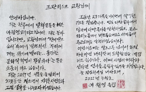 순례길은 2017년 5월 3일 서울에서 시작되었다. 이제 이원영은 트라시메노 호수에 있다. 그는 서울을 떠난 지 5년 후에 이탈리아에 도착했다. “세계의 안전과 생명을 지키기 위해서는 다른 방법을 시도하는 것이 시급합니다. 오늘날 전 세계 약 445개의 원자력발전소가 운영되고 있습니다. 아무것도 하지 않는 한 인류를 위한 미래는 없습니다.”