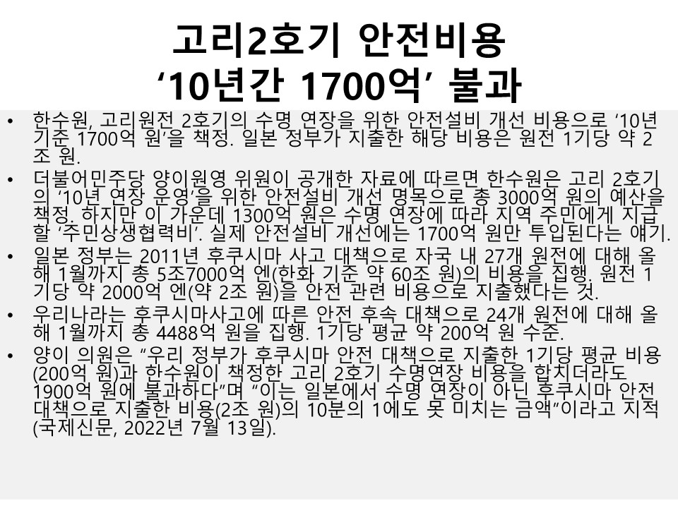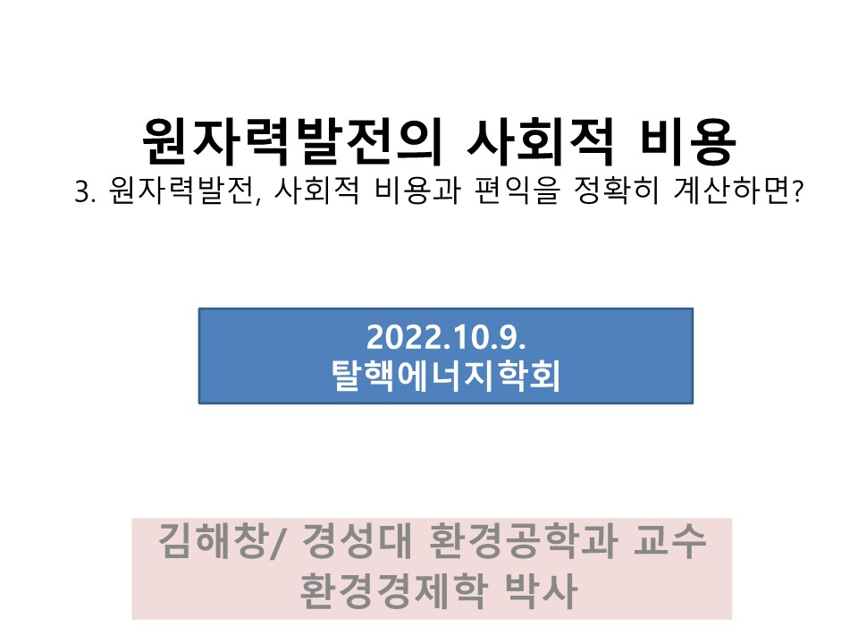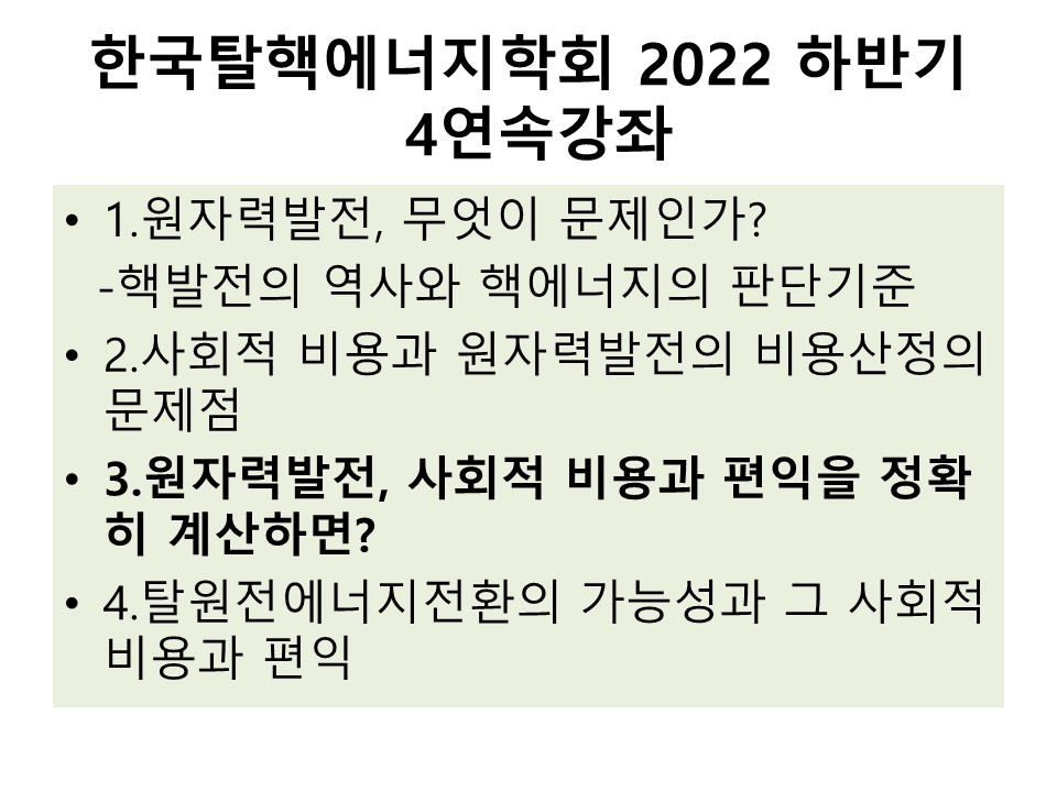 원자력의 사회적 비용 제3강 By liferoad.org on 10월 5, 2022 • ( 0 ) 한국탈핵에너지학회 2022년하반기 연속강좌 원자력 발전의 사회적 비용 강의: 김해창 (경성대 환경공학과 교수) 이 글 공유하기: 클릭하여 X에서 공유 (새 창에서 열림) X 페이스북에 공유하려면 클릭하세요. (새 창에서 열림) Facebook 좋아하기 가져오는 중...‹ [한겨레:온 연재] 생명탈핵실크로드원자력의 사회적 비용 제4강 ›카테고리:10월호, 2022년