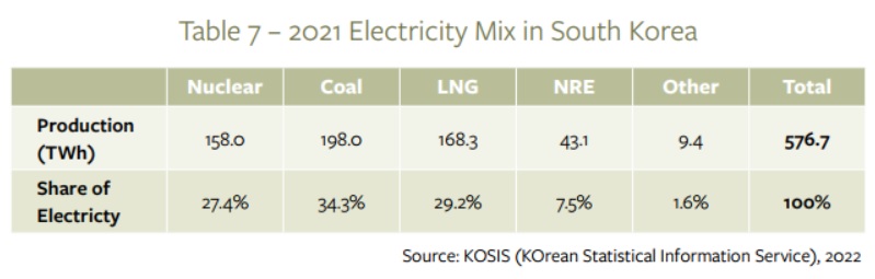 대한민국은 24개의 원자로를 운영하고 있으며, 3개의 원자로를 건설중에 있다. 한빛 4호기가 장기정전(LTO) 상태에 있는 것은 콘크리트 격납벽에서 발견된 140개의 공극과 격납건물 플레이트의 부식으로 인해 2017년 5월부터 가동이 중단됐기 때문이다. 2022년 5월 취임한 윤석열 대통령은 이전 문재인 행정부(2017~2022)의 탈원전 정책을 폐기했다. 차기 윤 정부는 2022년 8월 재생에너지 증가 속도를 늦추는 대신 발전에서 원자력 비중을 높이는 것을 골자로 한 ‘장기전력수급기본계획(BPE)’ 초안을 공개했다. 한국수력원자력(한수원, KHNP)이 보유한 한국의 원자력 발전소는 한빛, 한울, 고리, 월성 부지에 있다. 한국의 부지당 평균 원자로 수는 세계에서 가장 많다. 이중 부지에 7기의 원자로와 7,489MW 발전소가 있는 고리는 세계 최대의 원자력발전소이다. 국가통계포털(KOSIS)에 따르면 원자력은 2021년 158TWh(총)를 공급해 2020년 160TWh보다 약간 적은 27.5%의 전력을 공급한데 비해 2020년에는 29%의 전력을 공급했다. (표7)