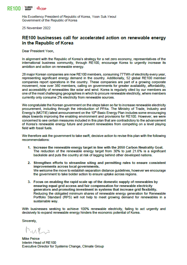 글로벌 RE100 캠페인을 주관하는 비영리단체 클라이밋그룹이 대표 명의로 윤석열 대통령에게 한국 정부의 재생에너지 목표 후퇴를 강력히 항의하는 서한을 보냈다. RE100 캠페인에 동참한 국내외 기업들을 대변해 서한을 보냈음을 분명히 함으로써, 사실상 기업들이 정부의 재생에너지 축소 정책에 위기감을 느끼고 있음을 드러냈다.