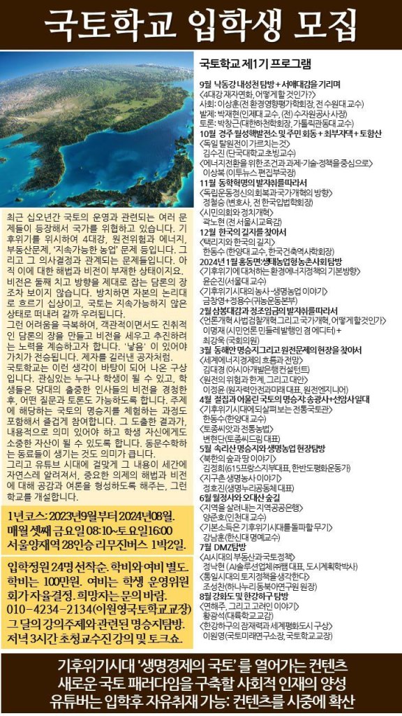 | 입학생 24명 선착순 모집공고 등록금은 학비와 여비를 이원화해서 12개월 학비(100만원)만 선납합니다. 직접경비인 여비는, 매월 편차가 있고 숙박과 식사의 수준에 대한 합의가 필요하므로 입학생들이 자체 운영위원회를 조직하여 금액과 지출방식 등을 결정하도록 하여 투명하게 운영하고자 합니다. 선착순으로 24인 입학생을 받고자 하오니, 문의를 해주시면 학비,입금계좌 등의 관련 정보를 알려드리고자 합니다. ▶ 문의 : 010-4234-2134 (이원영 국토학교 교장) |