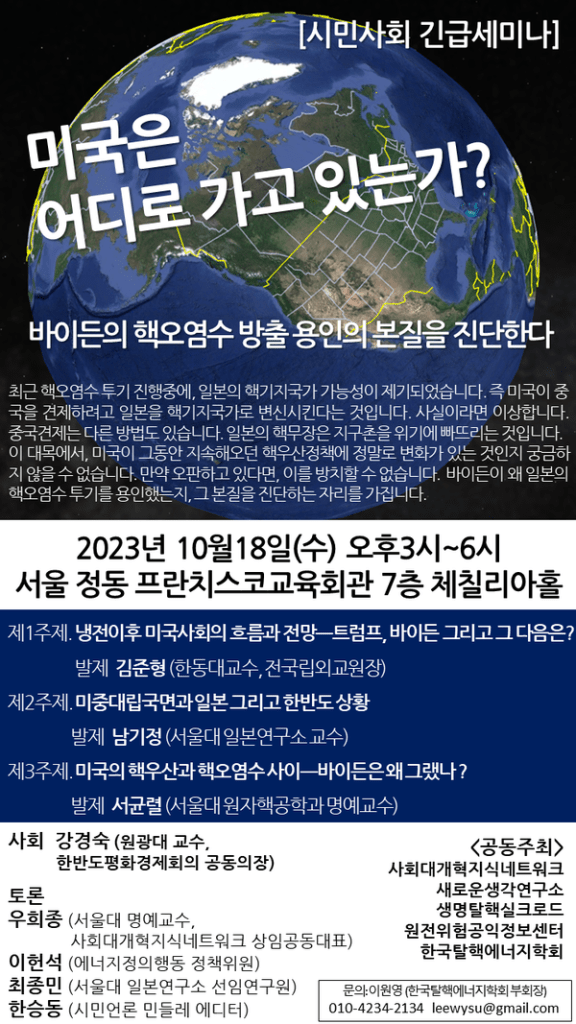 이에 바이든이 왜 일본의 핵오염수 투기를 용인했는지, 관계전문가들을 모시고 그 본질을 진단하는 자리를 가진다.