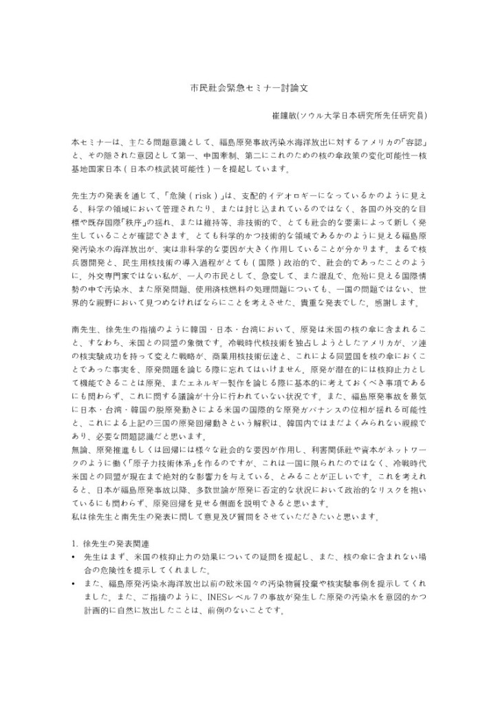 The professors’ presentation shows that “risk” is not managed and trapped in the realm of science, which seems to have acquired a dominant ideology, but is generated anew by non-technical and extremely social elements, such as each country’s diplomatic goals, the shaking or maintenance of the existing international “order. It is a very scientific and technical area, and it is clear that the marine discharge of the Fukushima nuclear power plant’s contaminated water was actually determined by non-scientific factors. As if the process of developing nuclear weapons and commercial introduction of nuclear technology for people’s livelihoods was extremely (international) political and social. It was a valuable announcement that, as a citizen, not a diplomatic expert, we should look at polluted water, nuclear power plants and the disposal of spent nuclear fuel from a global perspective, not just a national one. Thank you all.
