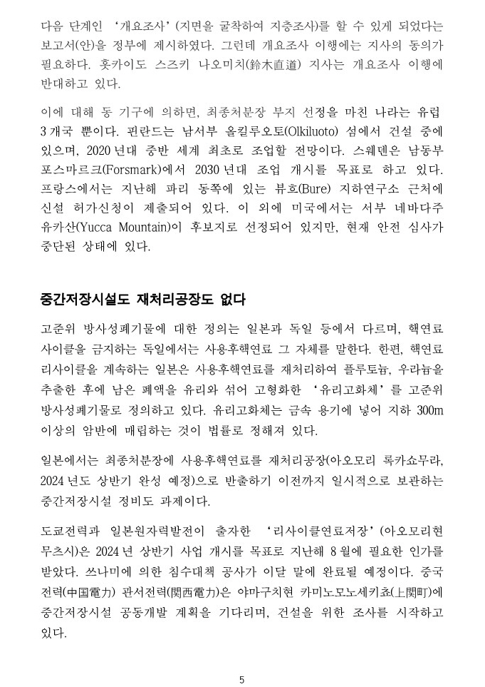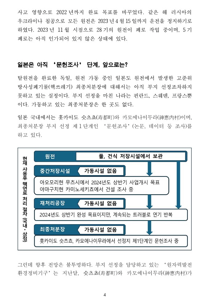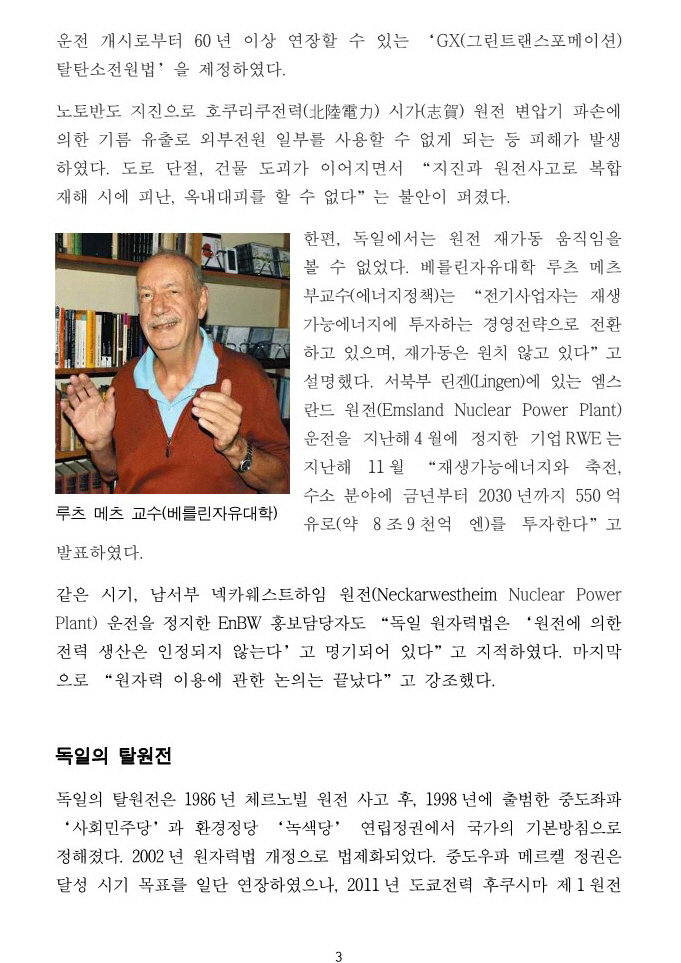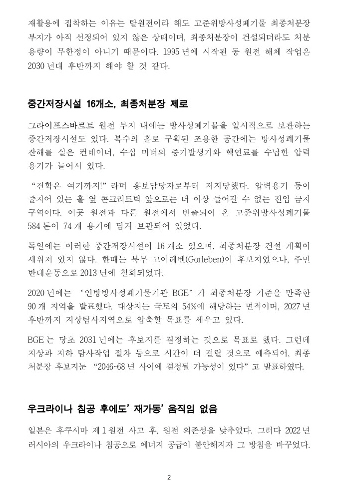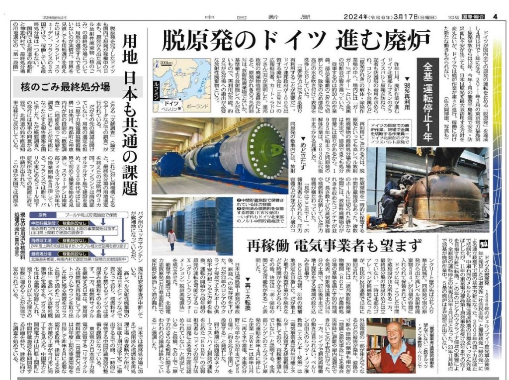 ‘탈원전’으로부터 1년, 폐로 작업이 착착 진행되고 있는 독일 … 일본도 안고 있는 공통과제는 어떻게 진행되고 있는가? By liferoad.org on 3월 21, 2024 • ( 0 ) 일본 주니치신문에 보도된 기사 https://www.tokyo-np.co.jp/article/315624 일본 도쿄신문에도 같이 보도되었습니다. 국문 번역글은 아래 있습니다. 번역자 : 박노보 박사 이 글 공유하기: 클릭하여 X에서 공유 (새 창에서 열림) X 페이스북에 공유하려면 클릭하세요. (새 창에서 열림) Facebook 좋아하기 가져오는 중...‹ [논문] Landsat 원격 감지 데이터를 기반으로 한 지난 20년간의 톈완(Tianwan) 원자력발전소의 열오염 모니터링고준위 핵폐기물, 핵발전 정책 포기로부터 시작해야… ›카테고리:2024년